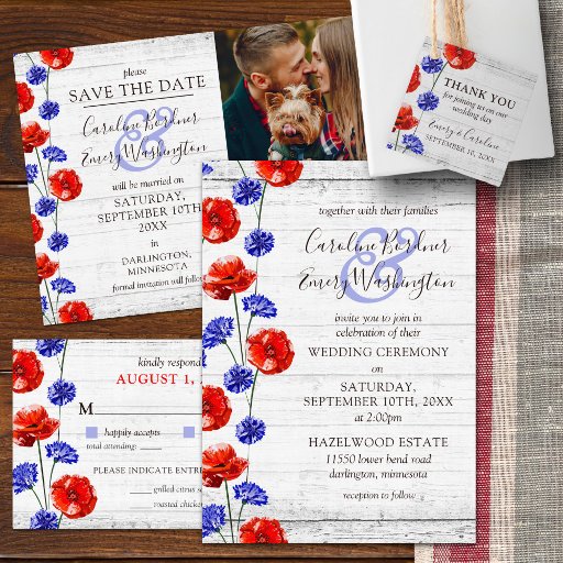 Coordinated Save-The-Date cards introduce your special day in a big way! Gorgeous, vibrant red poppies and pretty blue cornflowers offer an energetic pop of colour on rustic whitewash wood background. This modern-meets-farmhouse styled design is full of wildflower charm for the romantic country wedding!