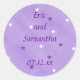A painting of purple and white stars on a blended lavender background, with Save the date and placeholders for the names and date, printed on stickers. The text is written in purple script. Easily customise on the template form. Great choice for wedding seals. Thank you for shopping at CherylsArt on Zazzle.