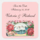 Custom Save the Date stickers with script letters and beautiful vintage Victorian art of a pair of elegant white swans floating on a lake framed by red roses and pink forget-me-not flowers. Click Customise It to change sizing, shape or background colours, even save your design for later.