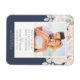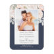 Celebrate your love with this save-the-date wedding magnet, featuring an elegant photo template accented by blush pink florals and botanical greenery foliage. The dark blue background adds a striking contrast, while the minimal typography and simple minimalist design offer timeless charm. Perfect as a magnetic engagement card, this piece beautifully highlights your classic engagement photography, creating a soft romantic keepsake your guests will cherish.