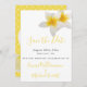 NewParkLane - Elegant 'Save the Date' wedding card, with two beautiful Hawaiian tropical flowers in watercolor, against a white background. On the backside two matching flowers, against a sunny yellow background with an stylish white trellis pattern.