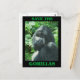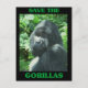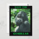 A close up of a beautiful adult gorilla in his natural habitat with the words Save the Gorillas surrounding it.