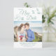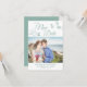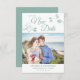 Elegant and romantic Save The New Date - wedding postponement photo card, featuring a beautiful and delicate mint green orchids floral line drawing on the upper part, over a white background. Easily personalizable by adding one of your favourite engagement horizontal pictures, and by editing the template fields on the lower band with your names, date, and location in a modern and simple green all-caps font.