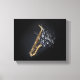 Saxophone on black background with musical notes flying out the bell. Visual representation of brass music