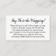 If you're hosting a gender-neutral, no-gift-wrap display baby shower for the new mummy-to-be, this simple card could be the choice for you. Using a pretty, modern script font, I first added a header that announces the intention in a mildly cheeky way: "Say No to the Wrapping!" on the front, and "to" and "from" for the gift tag side. The template field was set up to offer instructions for guests not wrapping their present; please feel free to change the wording in any way you wish. All fonts and colours can be modified as you see fit.