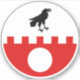 "Per fess embattled argent and gules, in pale a raven, close and sinister facing, sable and a plate argent."