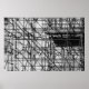 A black and white photo of scaffolding against a Portland Stone wall casting seemingly chaotic shadows creating an interesting abstract design.