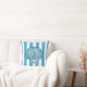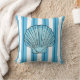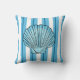 Ocean blue, seafoam blue and white stripes form the background of this nautically inspired pillow. In the foreground, a scalloped seashell. Perfect decor for you yacht or sailboat, or even for a houseboat.