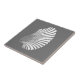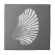 Ceramic tile in a block print, of a single scallop shell, in white on a graphite grey / grey background