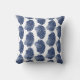 Throw pillow in a block print pattern, based on a scallop shell, in dark navy / indigo blue on a white background