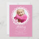 Pretty in pink and framed in white scallops. A round photo window invitation for your little girl's birthday. (FP)