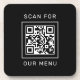 Modern and minimal black and white square plastic cork-backed beverage coaster with design created for a restaurant or bar features your custom QR code that will guide customers to "Scan for our Menu". The back of the card includes a company logo and custom text that can be personalised with the business name, website, or location. All wording can be customised so it suits the needs of your business. Black and white colour scheme can also be modified.