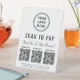 Simple table top pedestal sign for your business with 3 or your QR codes linked to payment apps for customers to scan for contactless mobile payments. Add your logo, QR codes, phone number and street address in simple typography.