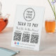 Simple table top pedestal sign for your business with 3 or your QR codes linked to payment apps for customers to scan for contactless mobile payments. Add your phone number and website in simple typography. Add your instagram and facebook user ids for customers to follow you on social media.