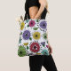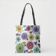 This tote bag has a scandi design of flowers made from circles, ovals, and half-circles with starbursts on them and leaves in periwinkle, yellow, green, turquoise, magenta, rust, and blue.