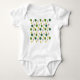 This baby bodysuit has a Scandinavian repeating design of a forest in brown and shades of green and yellow stars.