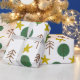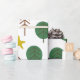 This wrapping paper has a Scandinavian repeating design of a forest in brown and shades of green and yellow stars.