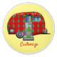 Cute rounded caravan travel trailer with a gnome in a green outfit, to customise, personalise by changing to your name on any background colour