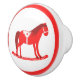 This awesome Christmas ceramic knob features a digital art image of a cute Scandinavian style rocking horse. The horse is red with a dark red mane, tail and hooves. The friendly horse is smiling. It has a white saddle and reins with pretty red Scandi folk style patterns on the saddle including the sun, moon and stars and hearts and flowers. The base of the rocking horse is red and is covered in pretty white leaves. The design was inspired by the Swedish Dala horse.