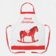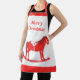 This awesome Christmas apron features a digital art image of a cute Scandinavian style rocking horse. The horse is red with a dark red mane, tail and hooves. The friendly horse is smiling. It has a white saddle and reins with pretty red Scandi folk style patterns on the saddle including the sun, moon and stars and hearts and flowers. The base of the rocking horse is red and is covered in pretty white leaves. The design was inspired by the Swedish Dala horse. There is custom text so you can personalise this design with your own message.