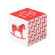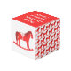 This awesome Christmas photo cube features a digital art image of a cute Scandinavian style rocking horse. The horse is red with a dark red mane, tail and hooves. The friendly horse is smiling. It has a white saddle and reins with pretty red Scandi folk style patterns on the saddle including the sun, moon and stars and hearts and flowers. The base of the rocking horse is red and is covered in pretty white leaves. The design was inspired by the Swedish Dala horse. There is custom text so you can personalise this design with your family name and a message.