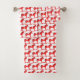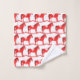 This awesome patterned Christmas bath towel set features a digital art image of a cute Scandinavian style rocking horse. The horse is red with a dark red mane, tail and hooves. The friendly horse is smiling. It has a white saddle and reins with pretty red Scandi folk style patterns on the saddle including the sun, moon and stars and hearts and flowers. The base of the rocking horse is red and is covered in pretty white leaves. The design was inspired by the Swedish Dala horse.