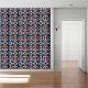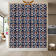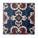 This tile design features a symmetrical, floral-inspired pattern with a colour palette of deep blues, reds, oranges, and off-white. The central motif is a diamond shape with a stylised flower inside, surrounded by curved, petal-like elements.