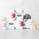 Holiday wrapping paper with a modern and simple pattern of red tulips and leaves in blue and green in a Scandinavian folksy style.