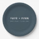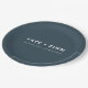 Simple, stylish custom wedding dinner paper plates in a modern minimalist scandi scandinavian design style with a contemporary typography in white on a dusky smoke blue background in an informal casual style. The text can easily be personalised for a unique one of a kind wedding design for your special day.