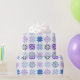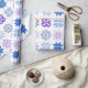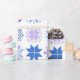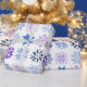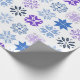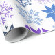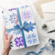 This wrapping paper has a winter design of different snowflakes in blues and purples in rows.