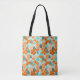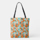This tote bag has a Scandinavian design of flowers and leaves in various shades of orange and teal.