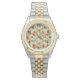 This women's watch has a Scandinavian design of flowers and leaves in various shades of orange and teal.