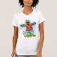 Don’t be scared it is just a scarecrow. They are designed to scare the birds away. This scarecrow has an orange top on and appears to be wearing a bucket on its head. It’s arms are outstretched and is is standing in some green grass. This scarecrow design looks great on this womens t-shirt. Perfect for yourself or as a gift