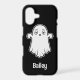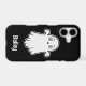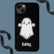 Destei's cartoon illustration of a cute ghost character looking frightened with big eyes and a round mouth. The background colour is black. There is also a personalizable text area for a name or other custom text. This design is ideal for Halloween time, for example.