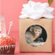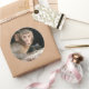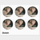 Round sticker of a scared monkey with big eyes looking like it is frightened by something or like it suddenly remembers something.