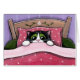 Whimsical cat art greeting card. Blank inside. Black cat peering out from above the bed sheets. Created from an original painting 2008 Lisa Marie Robinson