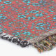 Intricate geometric patterns create a symmetrical design with vibrant red and blue hues. The repetitive motifs give a sense of movement and complexity.