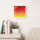 A yellow and red urban abstract of city scape buildings on a night sky in front of an orange moon.
