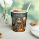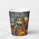 Halloween paper cups with creepy, strange kids. One looks like a porcelain doll with cracks, scars and scary eyes, there is a skeleton beast and a weird boy who also looks like a creepy porcelain doll, with spikes, scars, and bulging frightening eyes. Are they in costume, or beings from a dark evil castle?
