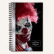 Scary Evil Clown Notebook. Here we have a notebook featuring everyone's worst nightmare: a creepy clown up close and personal smiling at ya! This notebook is perfect for a horror fan or someone who just likes scary clowns. This evil clown will either captivate or freak out people. Whether you're writing your deepest fears, taking school notes, journalling, writing office notes or unleashing your darkest creativity, this sinister notebook will always remind that nightmare can become real. Great as a gift for a horror fan. Perfect for school notes, keeping a diary, or as an office supply. #clown #evilclown #scaryclown #horror #scary