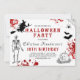 Halloween birthday invitation featuring blood splatters, a skeleton, pumpkin, bats, spider and web, and a witch/cat on a broom stick all set on a classic white background with an easy to personalise invitation template.