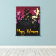Illustration of a scary Halloween scene with the grim reaper holding a skull in front of an old haunted house.