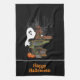 Decorate your kitchen with this scary black Halloween kitchen towel. This black towel features a haunted house, ghost, and orange pumpkin design. Buy a set of towels for yourself or give a set as a gift for that special someone.