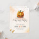 This invitation captures the eerie charm of Halloween with its radiant and thematic design. Set against a light orange backdrop adorned with glistening orange glitter, stars, and candy, this invitation emanates the enchantment of the season. At the top, a menacing jack-o'-lantern decorated with eerie green leaves takes centre stage, adding an element of fright to your pumpkin carving celebration.