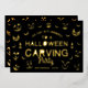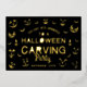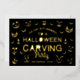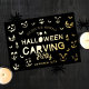 Announce your spooky Halloween pumpkin carving party and invite your guests with our scary jack-o-lantern carving pumpkin faces. Our design features different glowing scary pumpkin carving faces peeking through the darkness in gold foil. Bats and waxed candles add to the scary Halloween invitation. The reverse side features the spooky Halloween pumpkin carving faces with the details of Halloween placed in the centre. All illustrations contained in this spooky Halloween pumpkin carving invitation are hand-drawn original artwork by Moodthology. You can customise the text size, text colour, font, and layout for your own personal design preference.