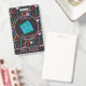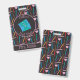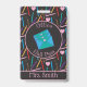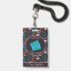A personalised office hall pass badge with the illustrations of some coloured pencils in the background and a stack of envelopes . Choose if you want an attachment (lanyard or metal clip or none). Check out collection to see the entire series .