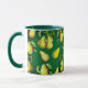 Coffee mug in a print of scattered pears and leaves, adapted from vintage botanical art, on a deep emerald green background