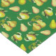 Table runner in a print of scattered pears and leaves, adapted from vintage botanical art, on a deep emerald green background