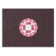 This sweet tablecloth features a pattern made up of cherries in red and purple watercolor hues along with a circular motif in pink and white and more cherries in the centre.