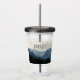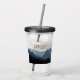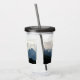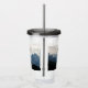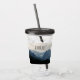 Acrylic tumbler with a photograph of beautiful mountains, cloudy sky, and rolling hills filled with trees in the foreground. Grey blue colour scheme.